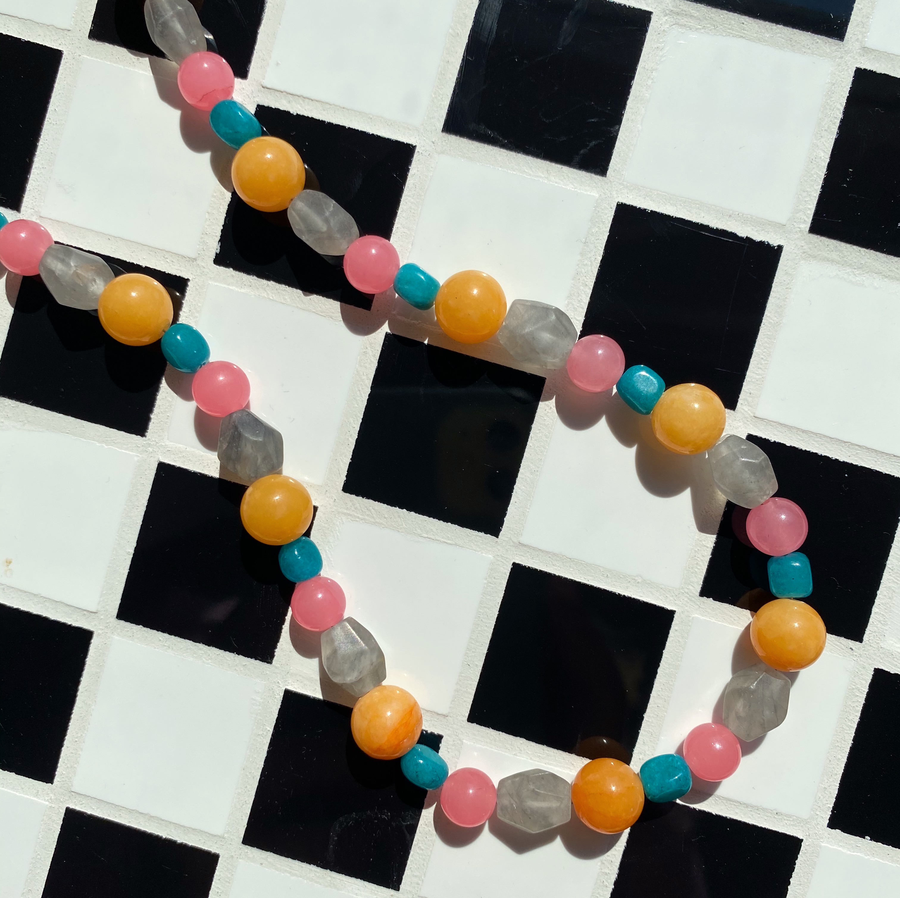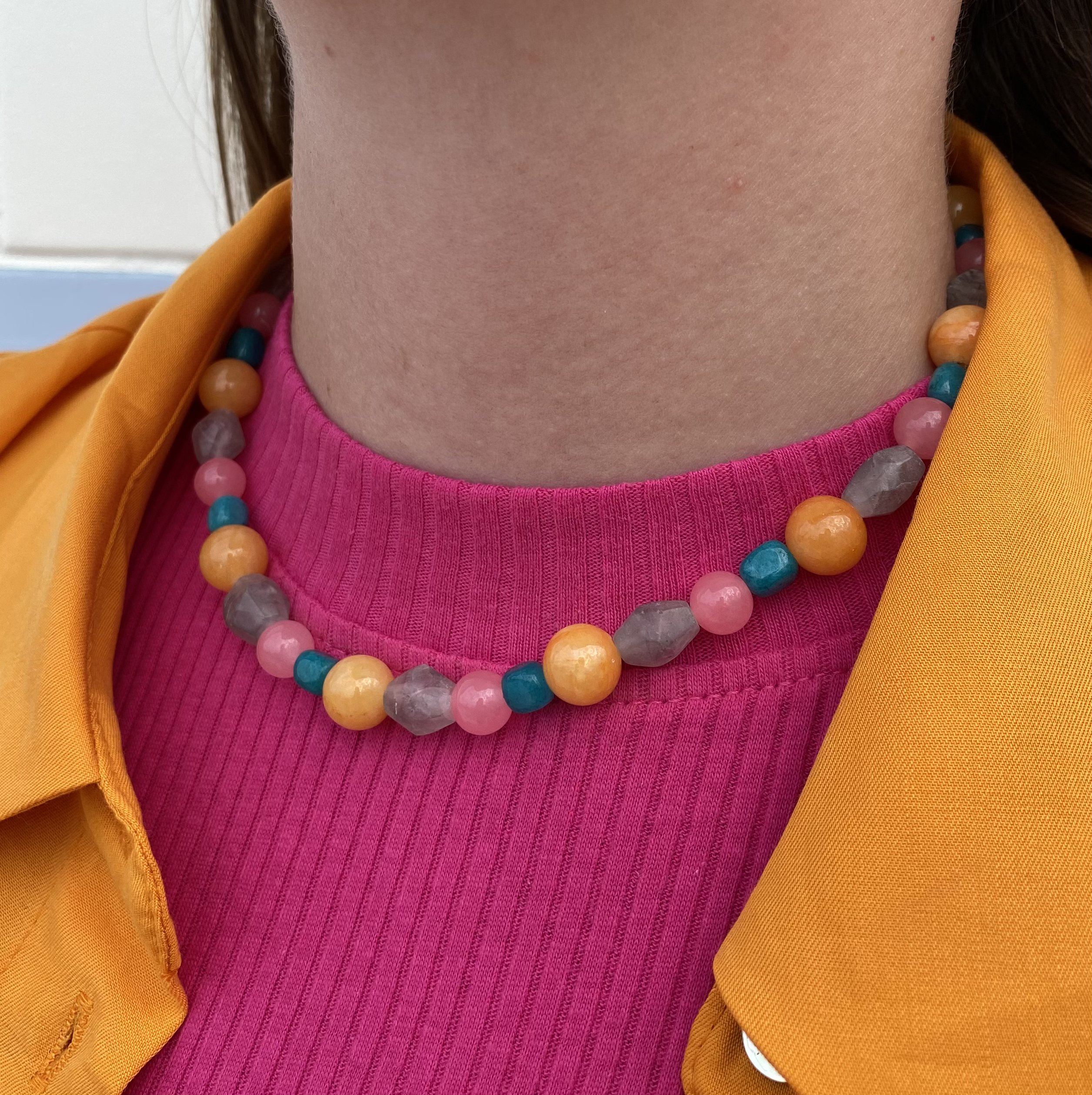 Nasza nowość!! Ten naszyjnik wykonany jest z naturalnych pereł, i kamieni. Wszystko uzupełnione jest elementami wykonanymi ze pozłacanego srebra próby 925. Całość utrzymana jest w kolorystysce pomarańczu, szarości, różu i turkusu . Świetnie komponuje się z naszymi pozostałymi modelami, zwłaszcza tymi na delikatnym łańcuszku.