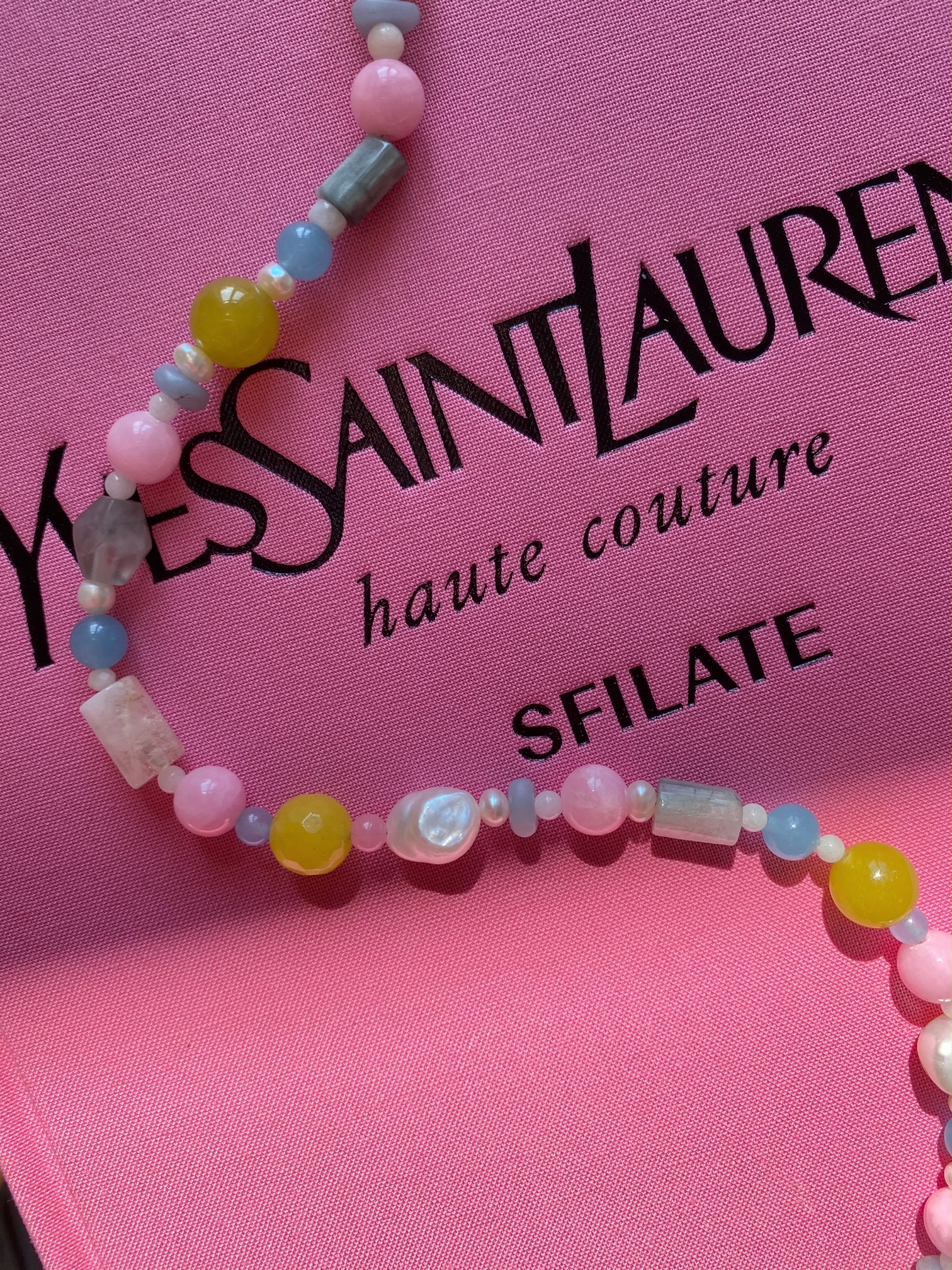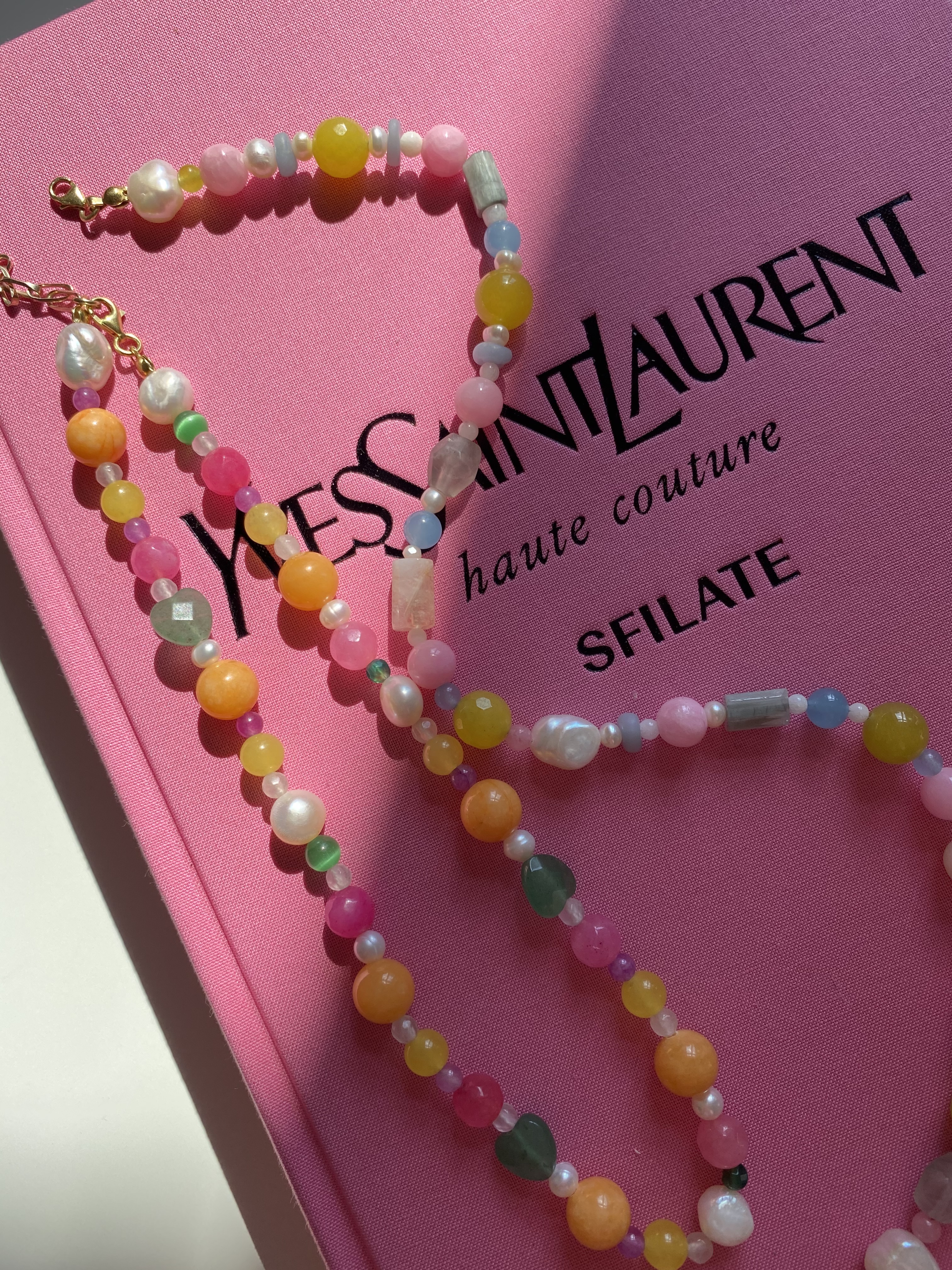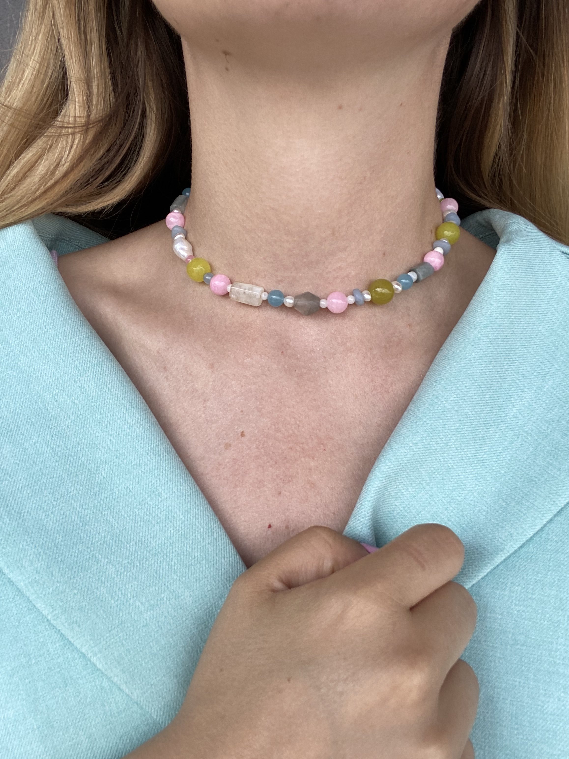 Nasza nowość!! Ten naszyjnik wykonany jest z naturalnych pereł, i kamieni. Wszystko uzupełnione jest elementami wykonanymi ze pozłacanego srebra próby 925. Całość utrzymana jest w kolorystysce limonki, szarości, różu i błękitu . Świetnie komponuje się z naszymi pozostałymi modelami, zwłaszcza tymi na delikatnym łańcuszku.
