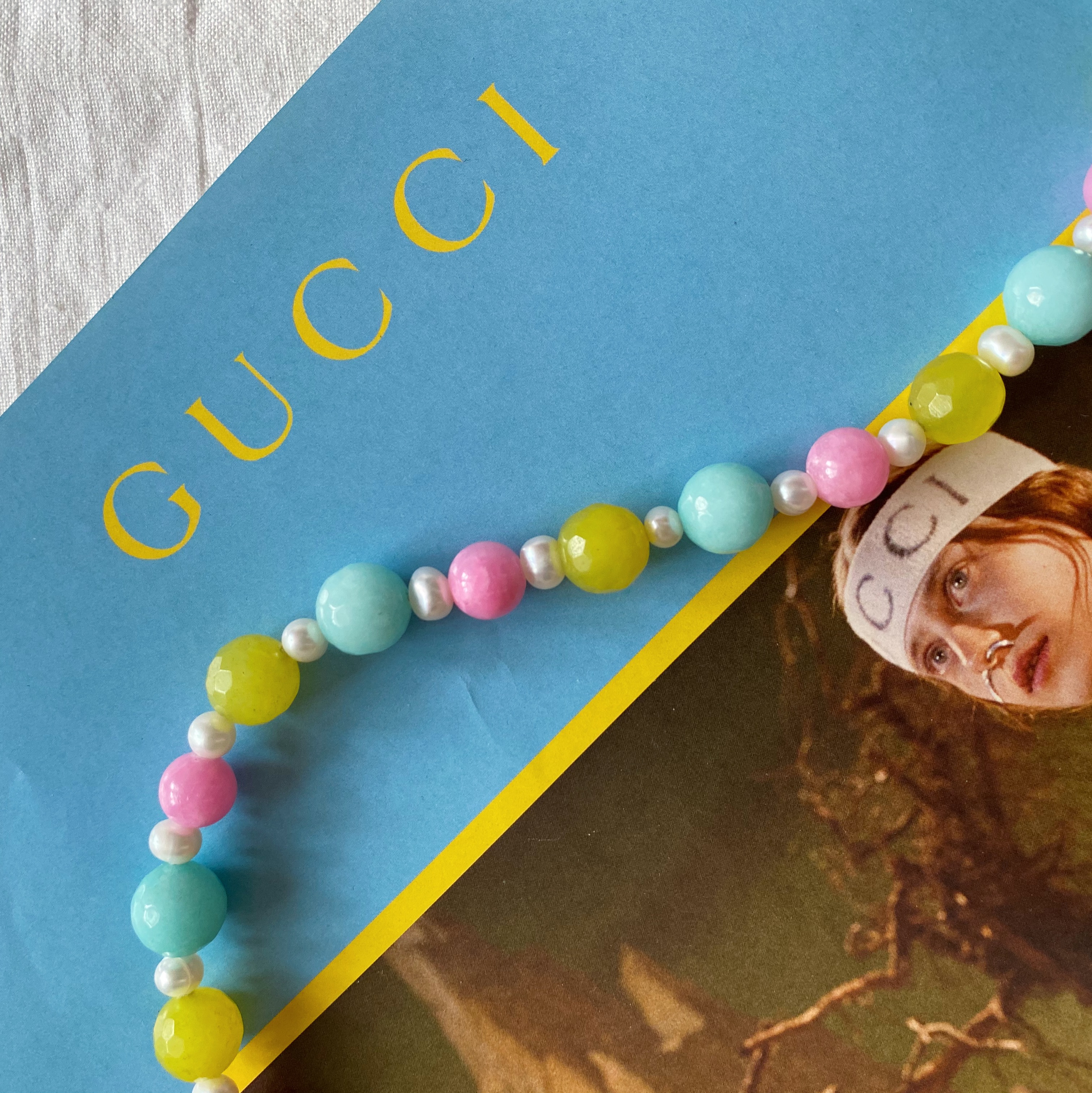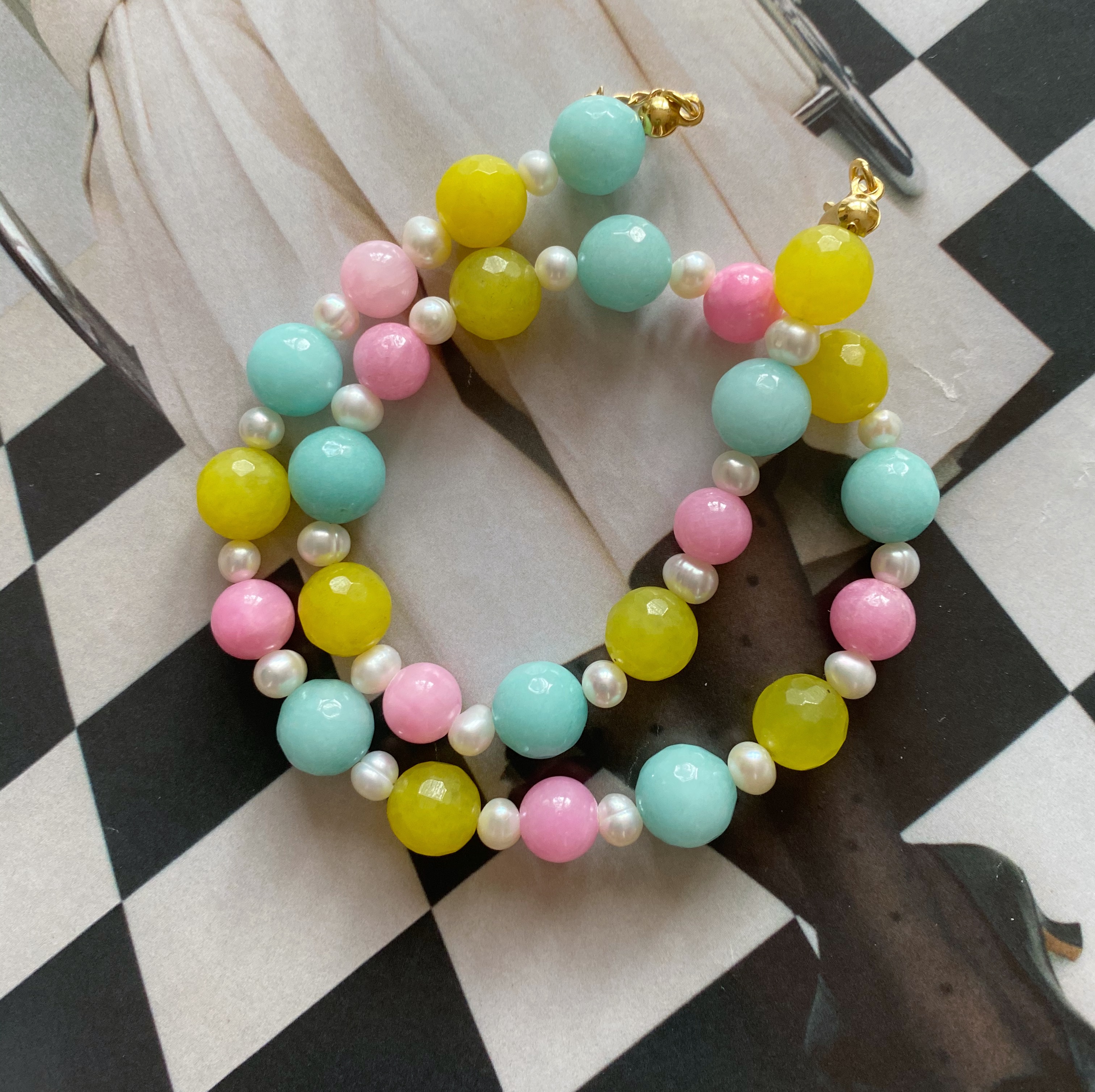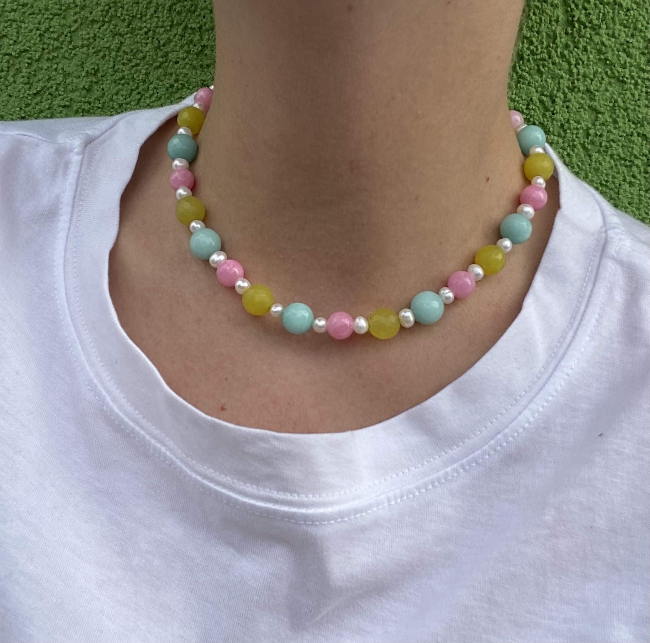 Nasza nowość!! Ten naszyjnik wykonany jest z naturalnych kamieni oraz pereł. Wszystko uzupełnione jest elementami wykonanymi ze pozłacanego srebra próby 925. Całość utrzymana jest w pięknej, kolorystyce różu bubble gum, limonki i mięty. Idealnie prezentuje się do każdej stylizacji. Świetnie komponuje się z naszymi pozostałymi modelami.