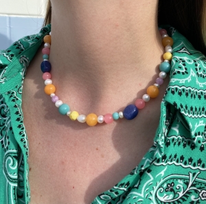 Nasza nowość!! Ten naszyjnik wykonany jest z naturalnych pereł, i kamieni. Wszystko uzupełnione jest elementami wykonanymi ze pozłacanego srebra próby 925. Całość utrzymana jest w pięknej, intensywnej kolorystyce. Świetnie komponuje się z naszymi pozostałymi modelami, zwłaszcza tymi na delikatnym łańcuszku.