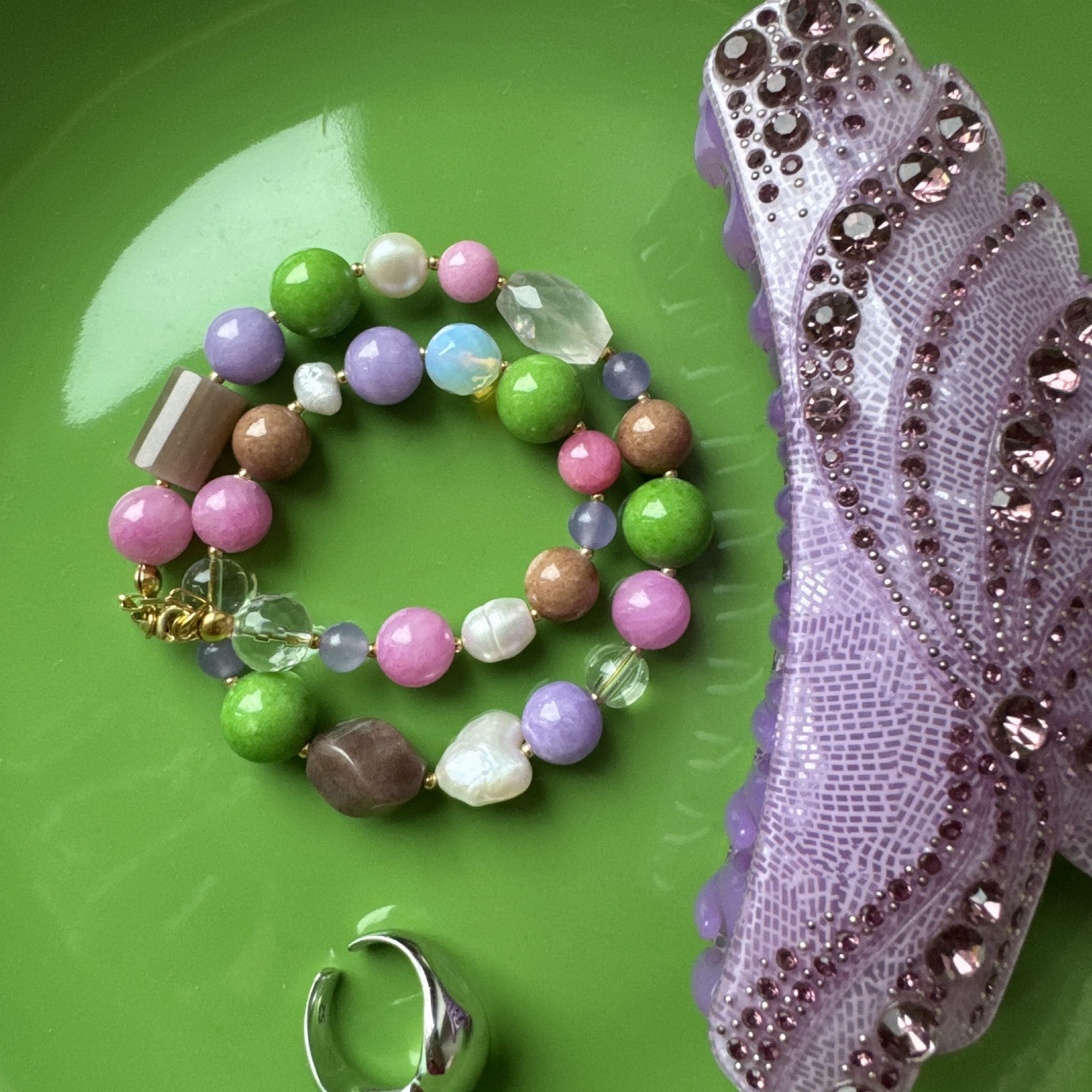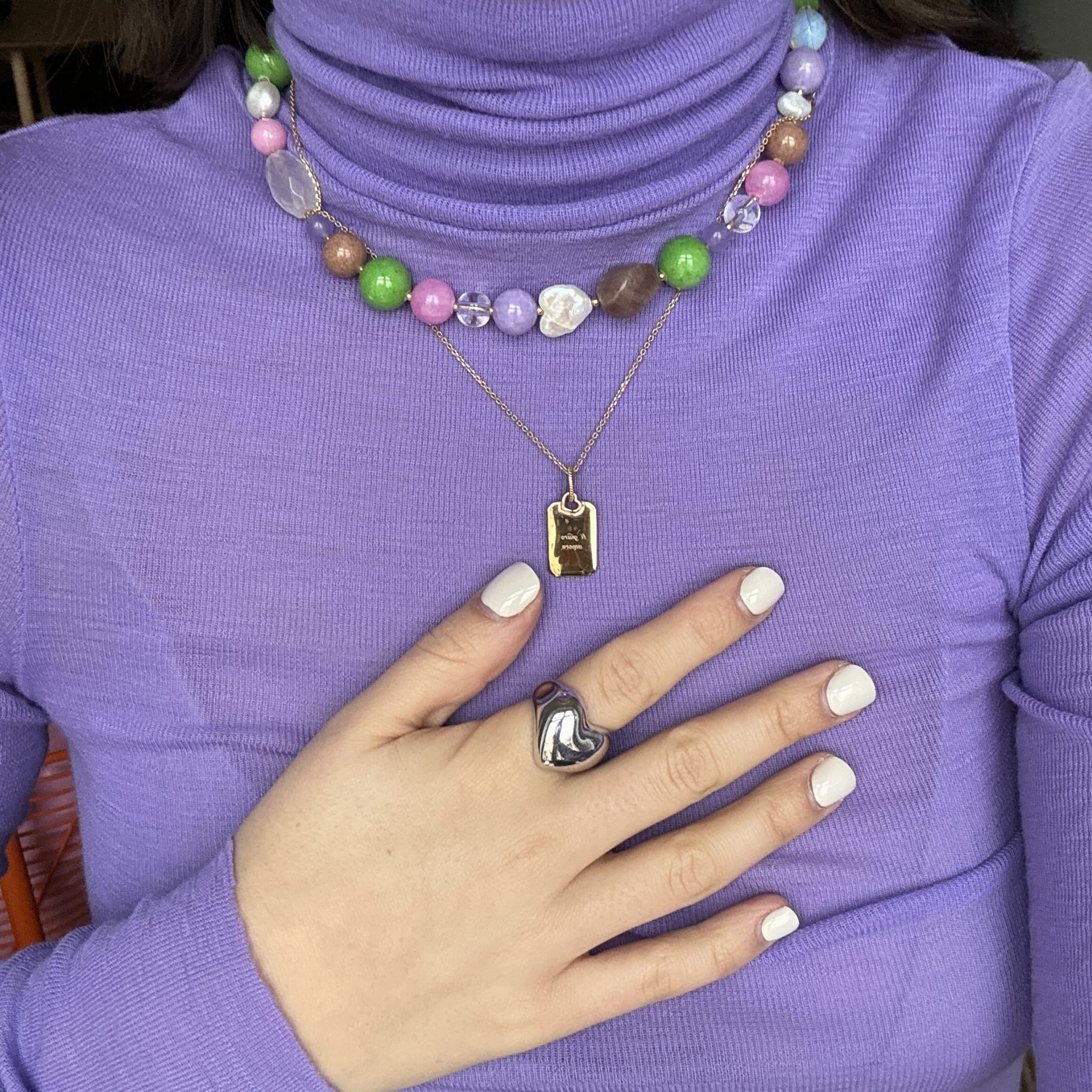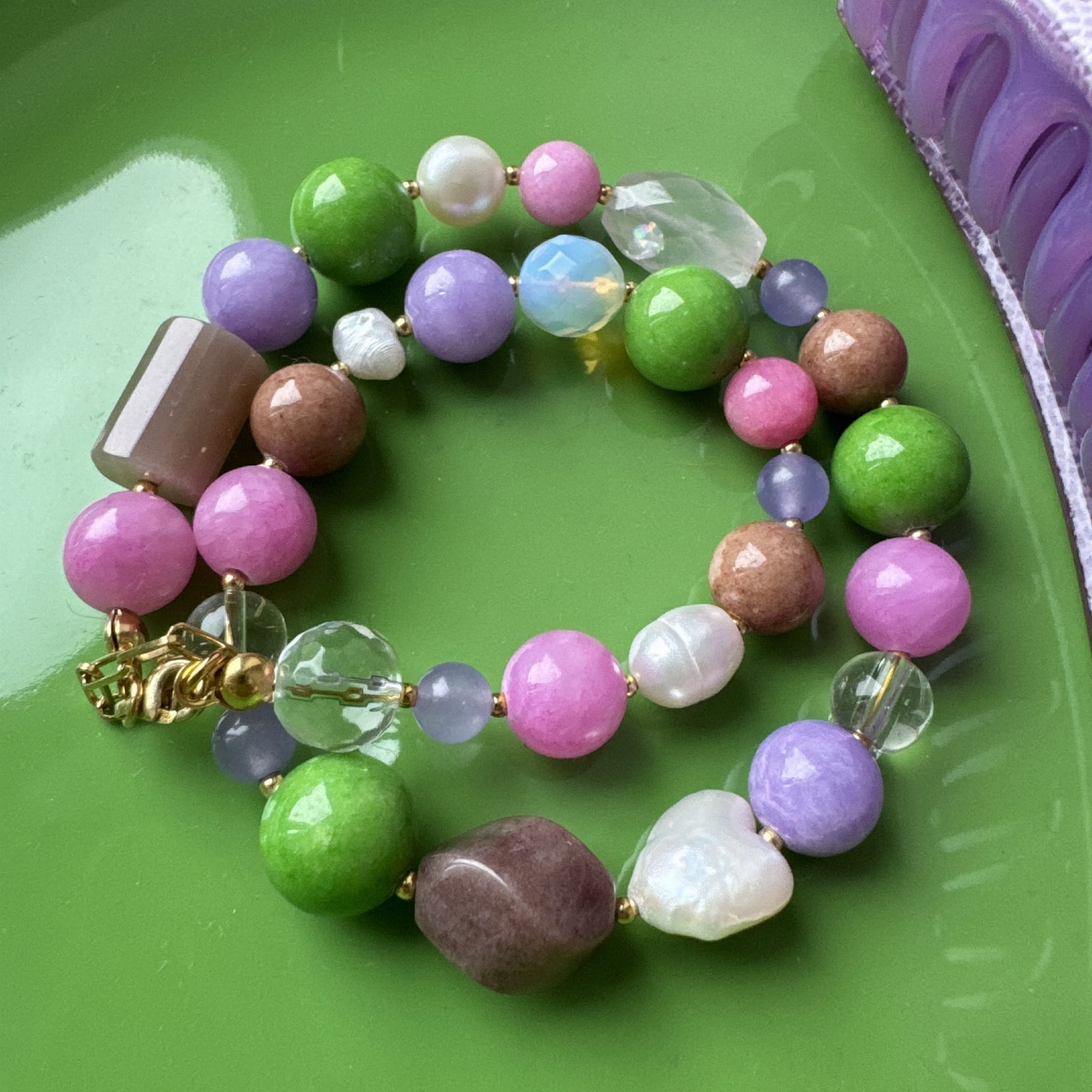 Nasza nowość!! Ten naszyjnik wykonany jest z pereł oraz kamieni o różnych kształtach wśród, których znajdziemy m.in jadeit, czy perły w kształcie serca. Wszystko uzupełnione jest elementami wykonanymi ze pozłacanego srebra próby 925. Jego delikatna kolorystyka sprawia, że jest to idealny wybór jeśli szukasz kolorowej lecz subtelnej biżuterii.
