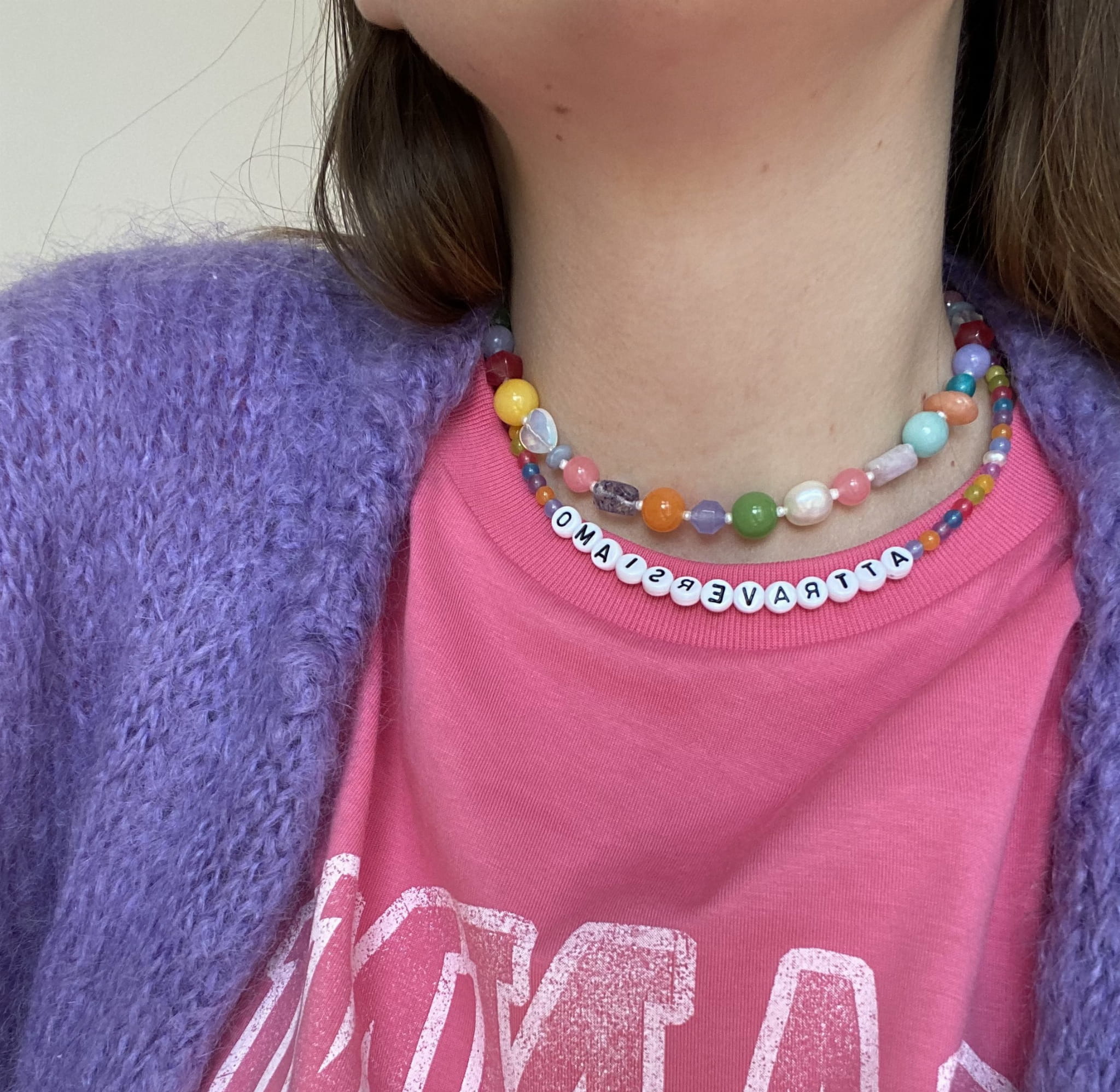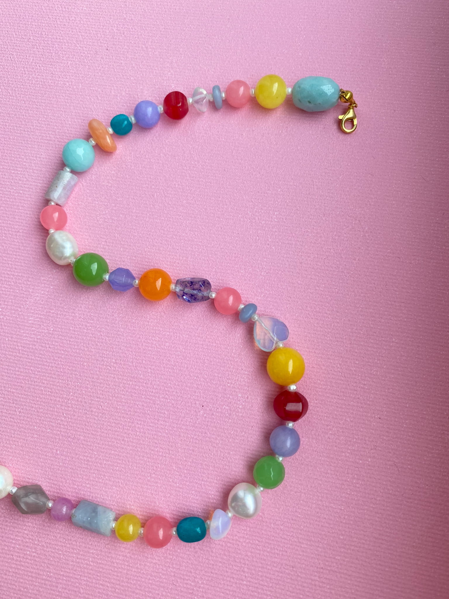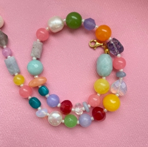 Nasza nowość!! Ten naszyjnik wykonany jest z naturalnych pereł, i kamieni od jadeitu poprzez kamień księżycowy. Wszystko uzupełnione jest elementami wykonanymi ze pozłacanego srebra próby 925. Całość utrzymana jest w pięknej, barwnej kolorystyce i idealnie prezentuje się do każdej stylizacji. Świetnie komponuje się z naszymi pozostałymi modelami.