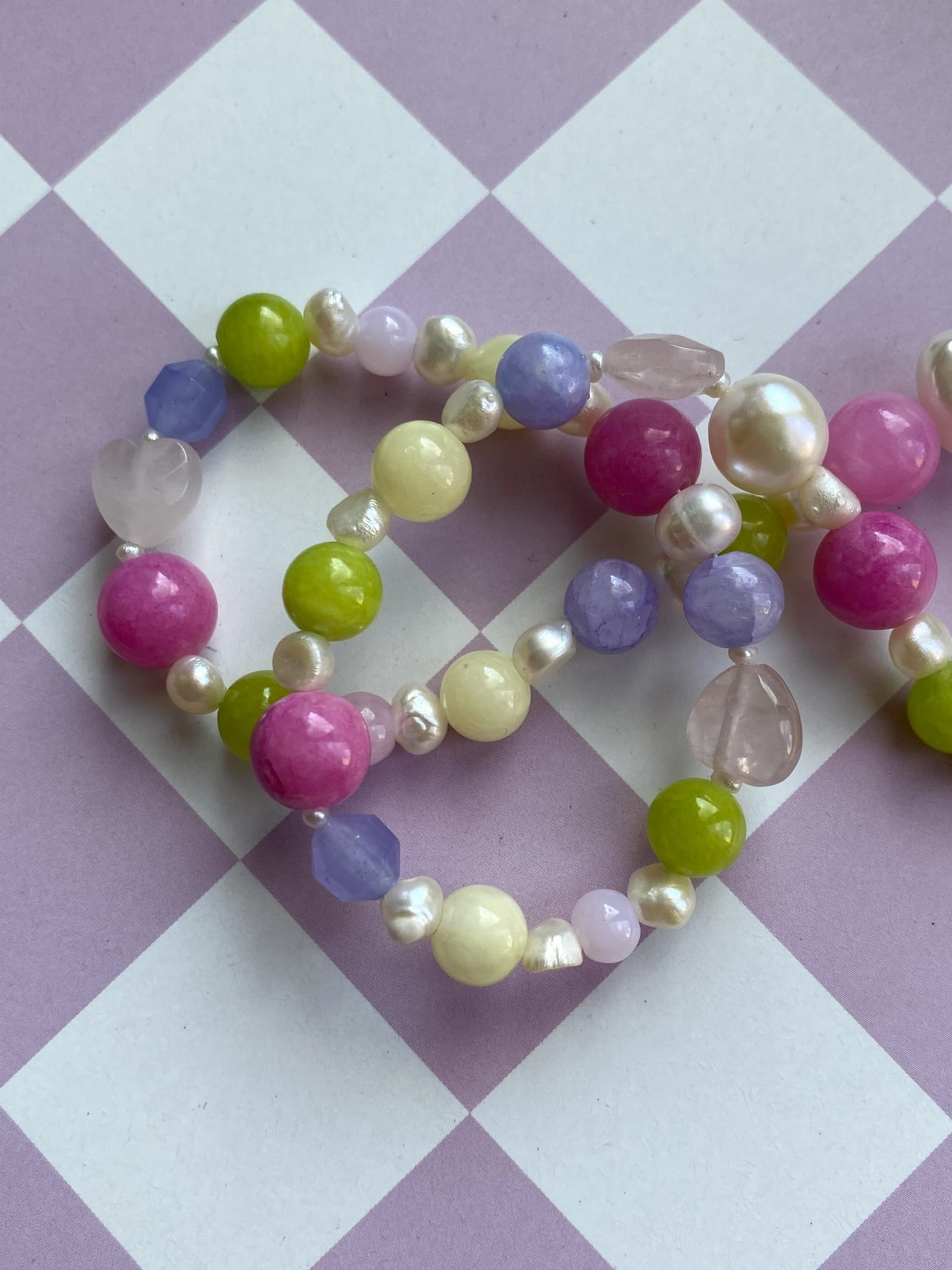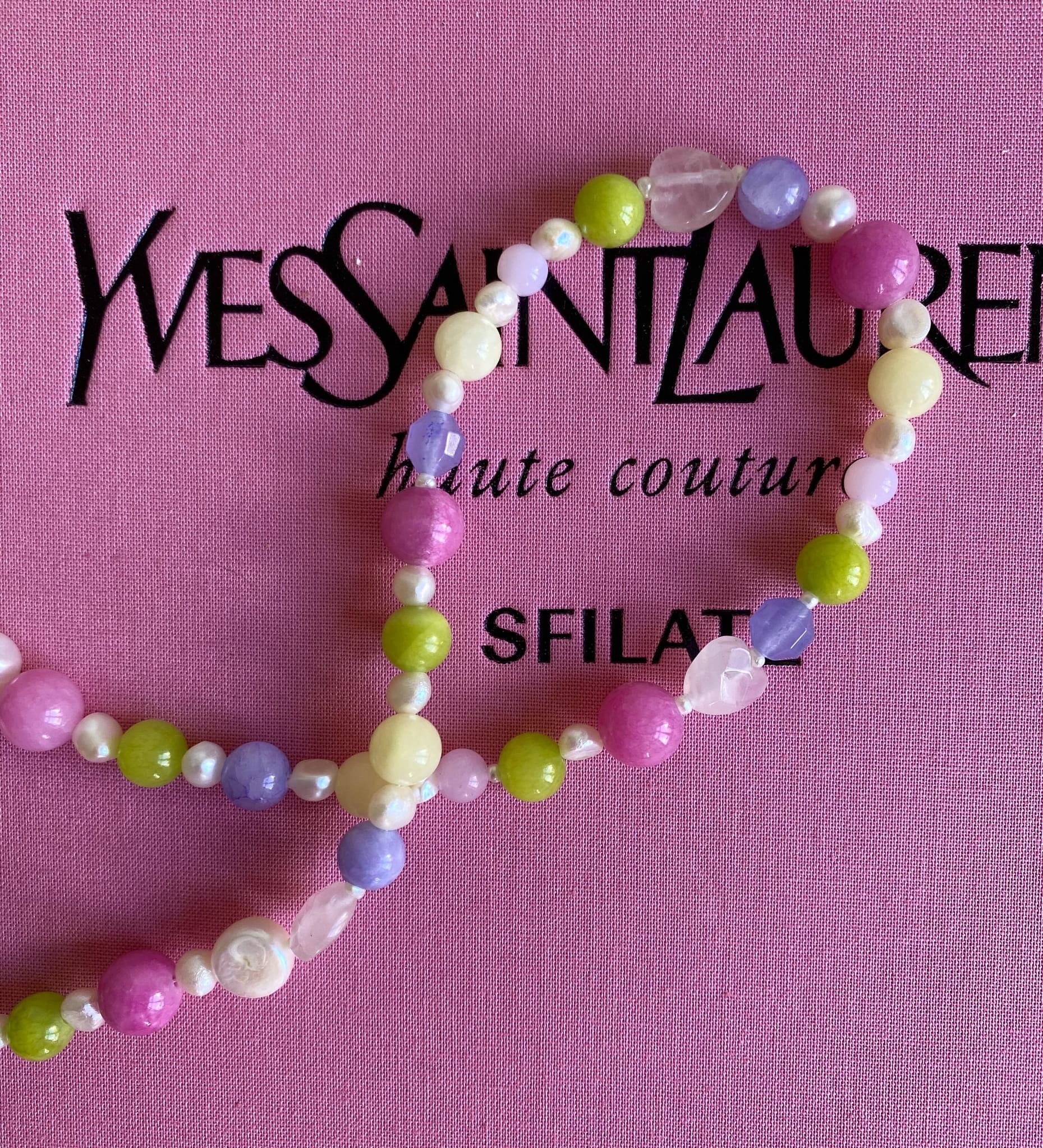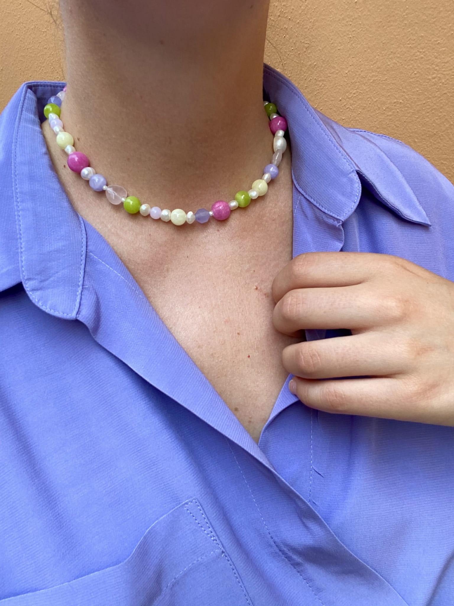 Nasza nowość!! Ten naszyjnik wykonany jest z naturalnych pereł, i kamieni. Wszystko uzupełnione jest elementami wykonanymi ze pozłacanego srebra próby 925. Całość utrzymana jest w kolorystyce mocnego różu, lawendy i zieleni . Świetnie komponuje się z naszymi pozostałymi modelami, zwłaszcza tymi na delikatnym łańcuszku.