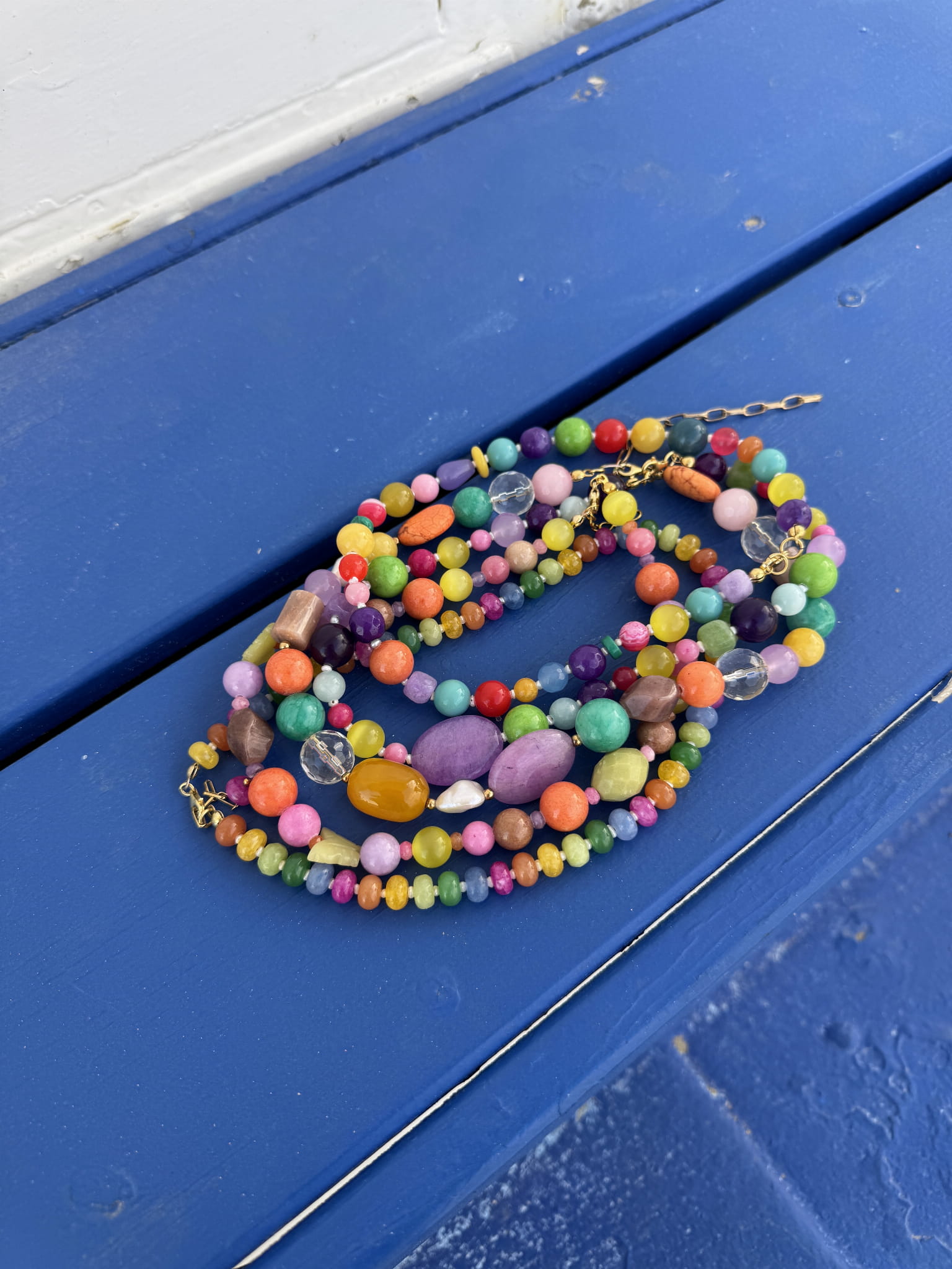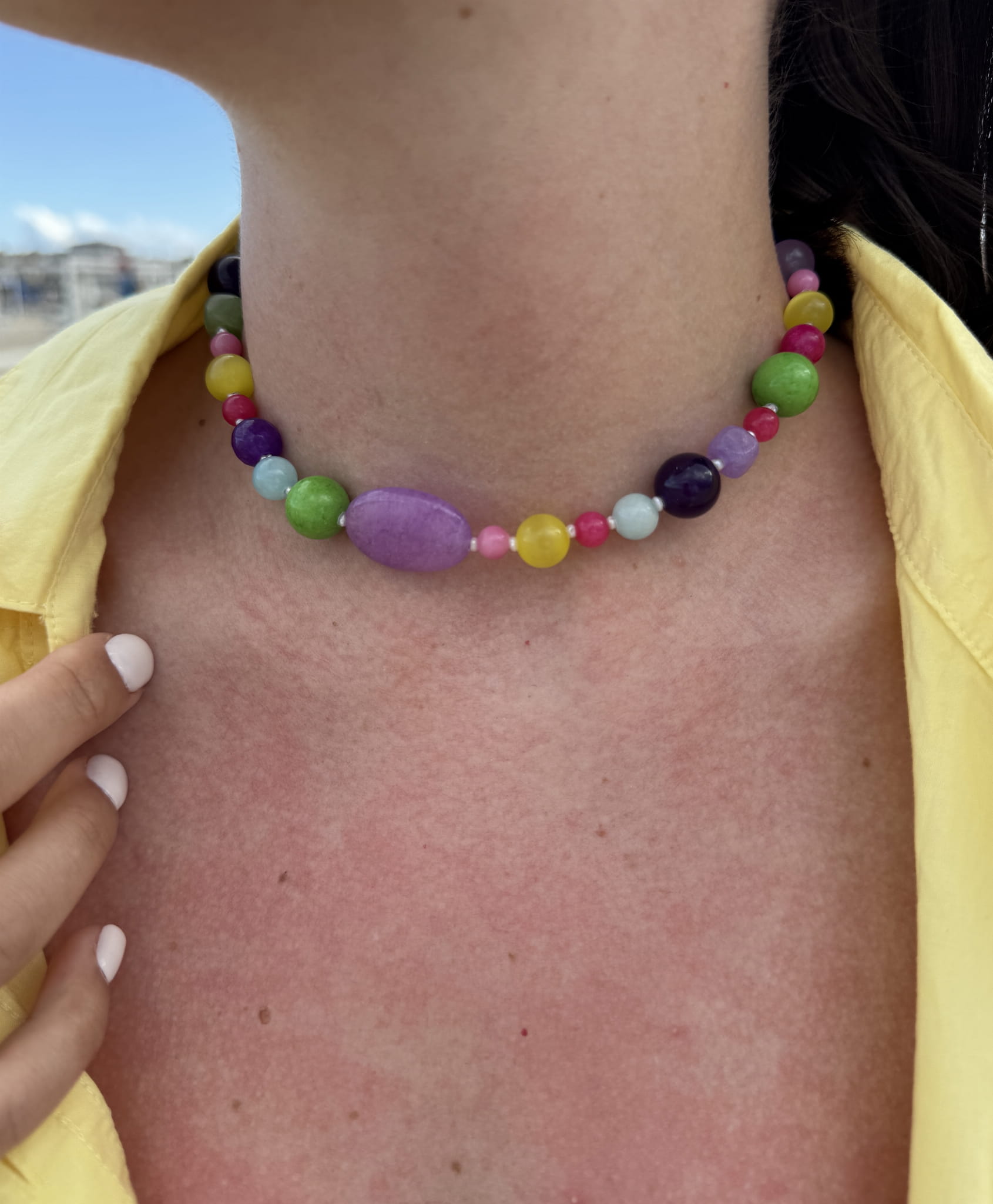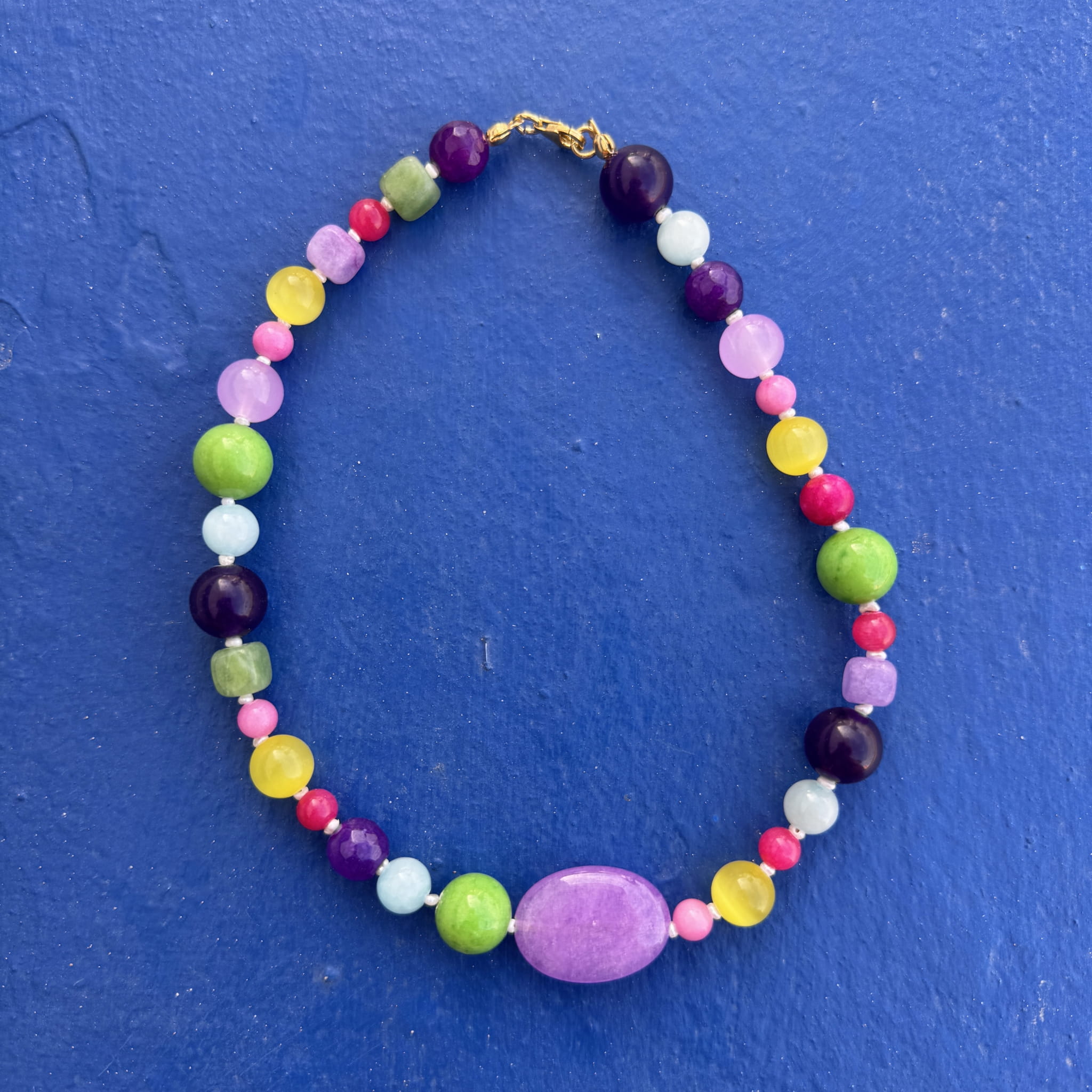 Nasza nowość!! Ten naszyjnik wykonany jest z małych pereł, i kamieni w przepięknej kolorystyce wśrod których znajdziemy m.in Agat, jadeit, ametyst, . Wszystko uzupełnione jest elementami wykonanymi ze pozłacanego srebra próby 925. Świetnie komponuje się z naszymi pozostałymi modelami.