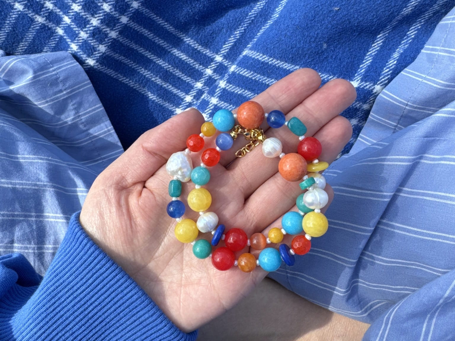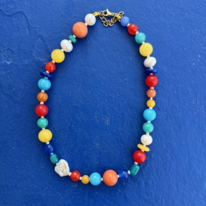Nasza nowość!! Ten naszyjnik wykonany jest z małych pereł, i kamieni w przepięknej kolorystyce wśrod których znajdziemy m.in jadeit, ametyst czy agat. Wszystko uzupełnione jest elementami wykonanymi ze pozłacanego srebra próby 925.