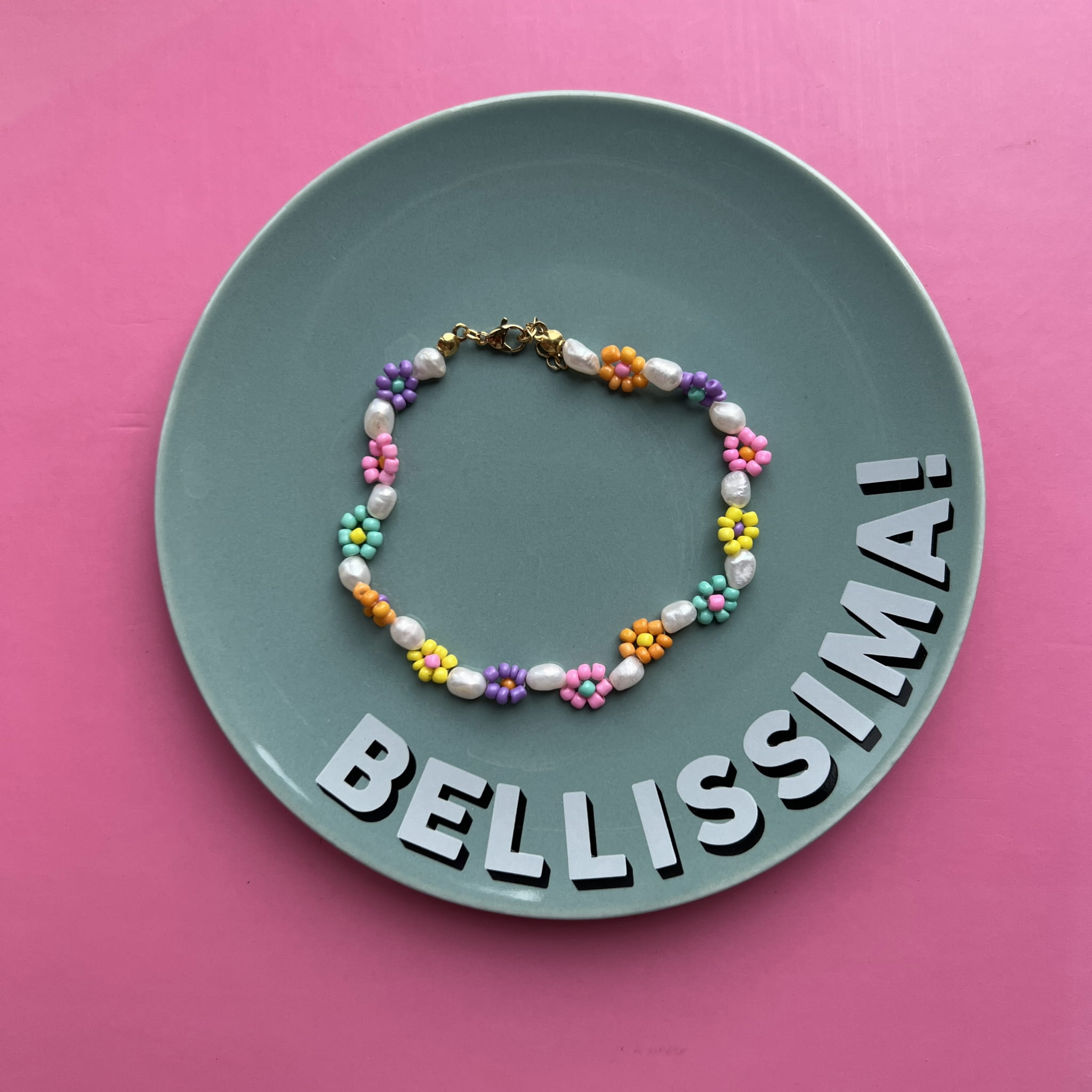 Bransoletka na nogę z motywem kwiatów i dodatkiem pereł idealnie przedłuży nam lato. Świetnie wygląda także do skarpetek i mokasynów. Całość uzupełniona jest delikatnym, pozłacanym zapięciem.