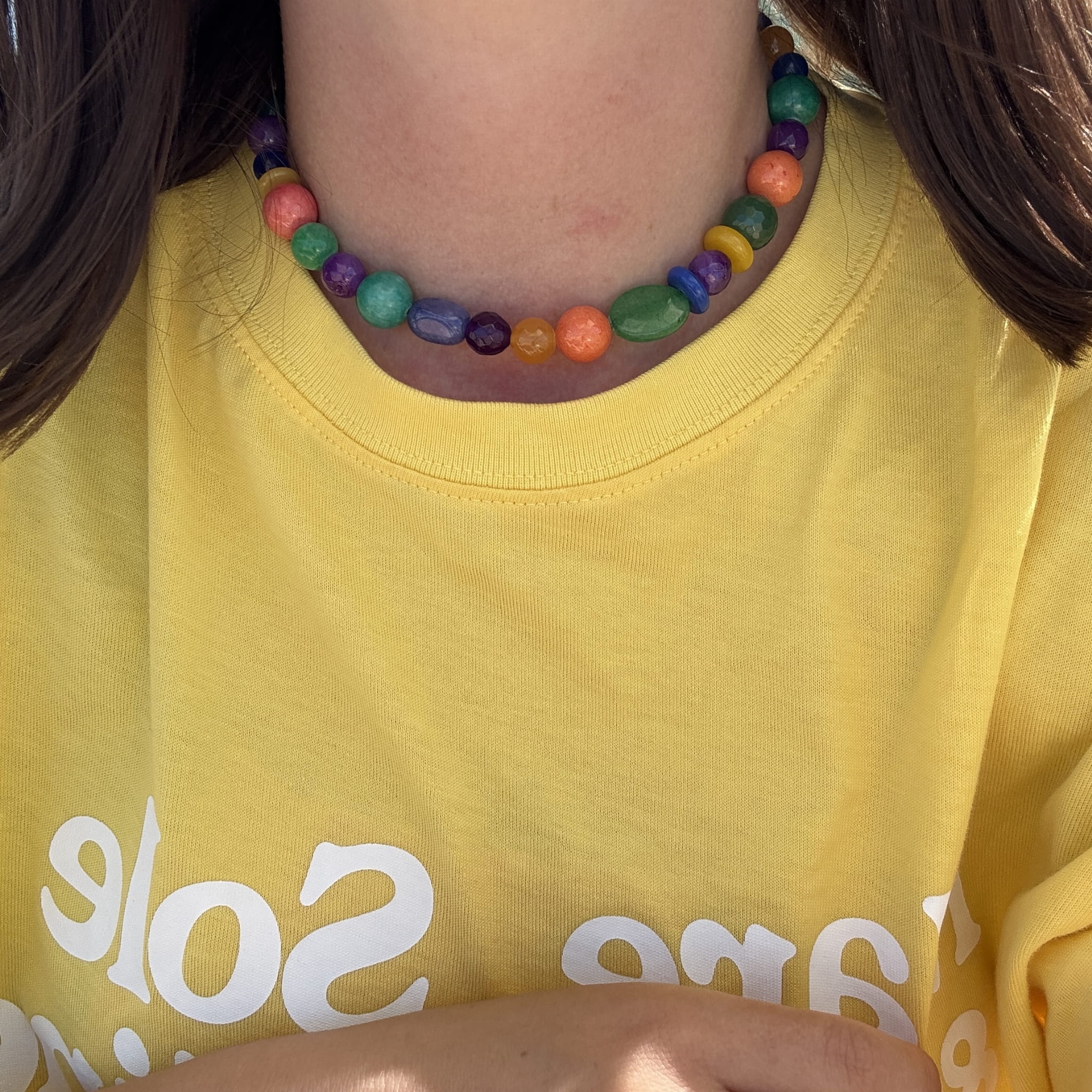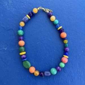 Nasza nowość!! Ten naszyjnik wykonany jest z kamieni w przepięknej kolorystyce wśrod których znajdziemy m.in Agat, jadeit, ametyst . Wszystko uzupełnione jest elementami wykonanymi ze pozłacanego srebra próby 925. Świetnie komponuje się z naszymi pozostałymi modelami.