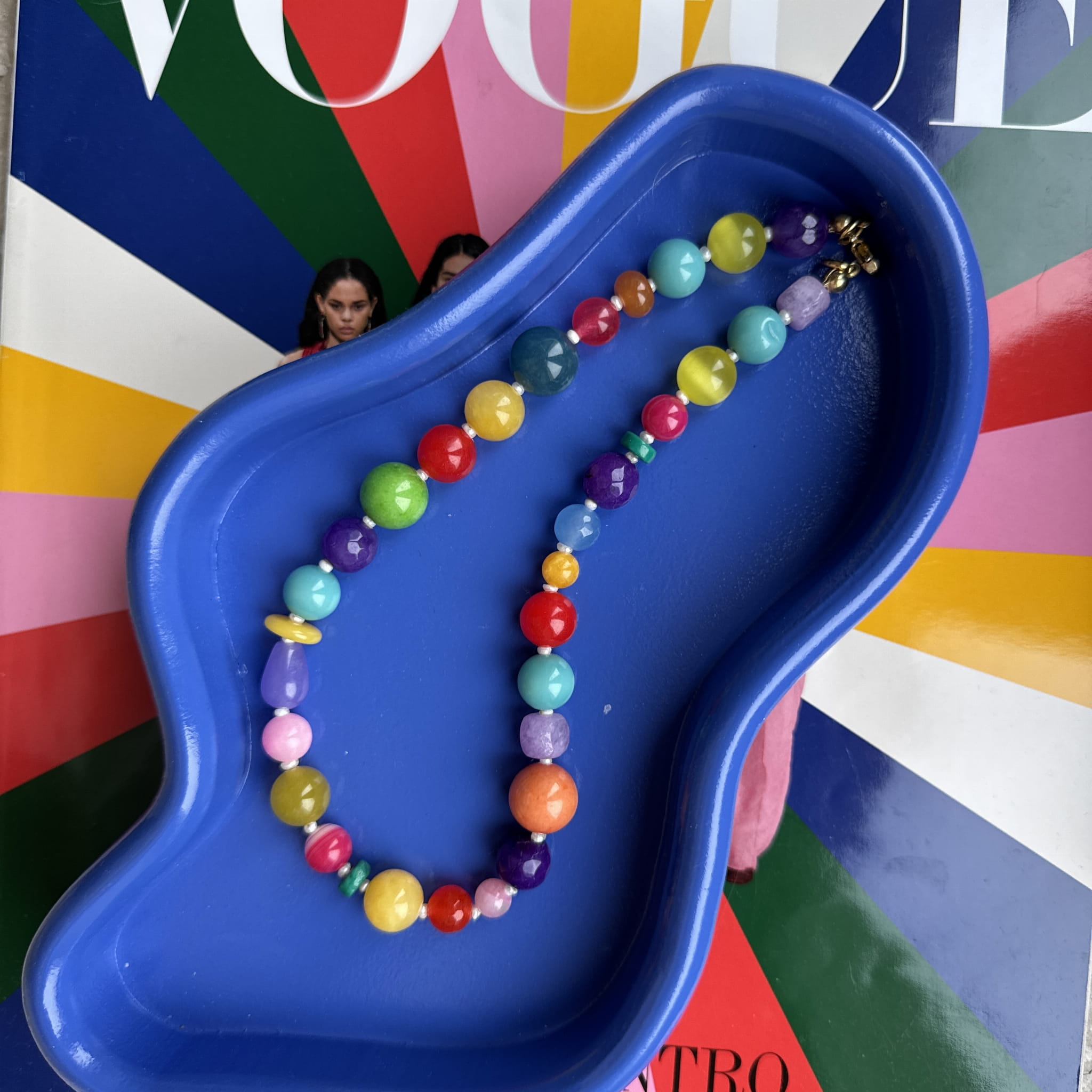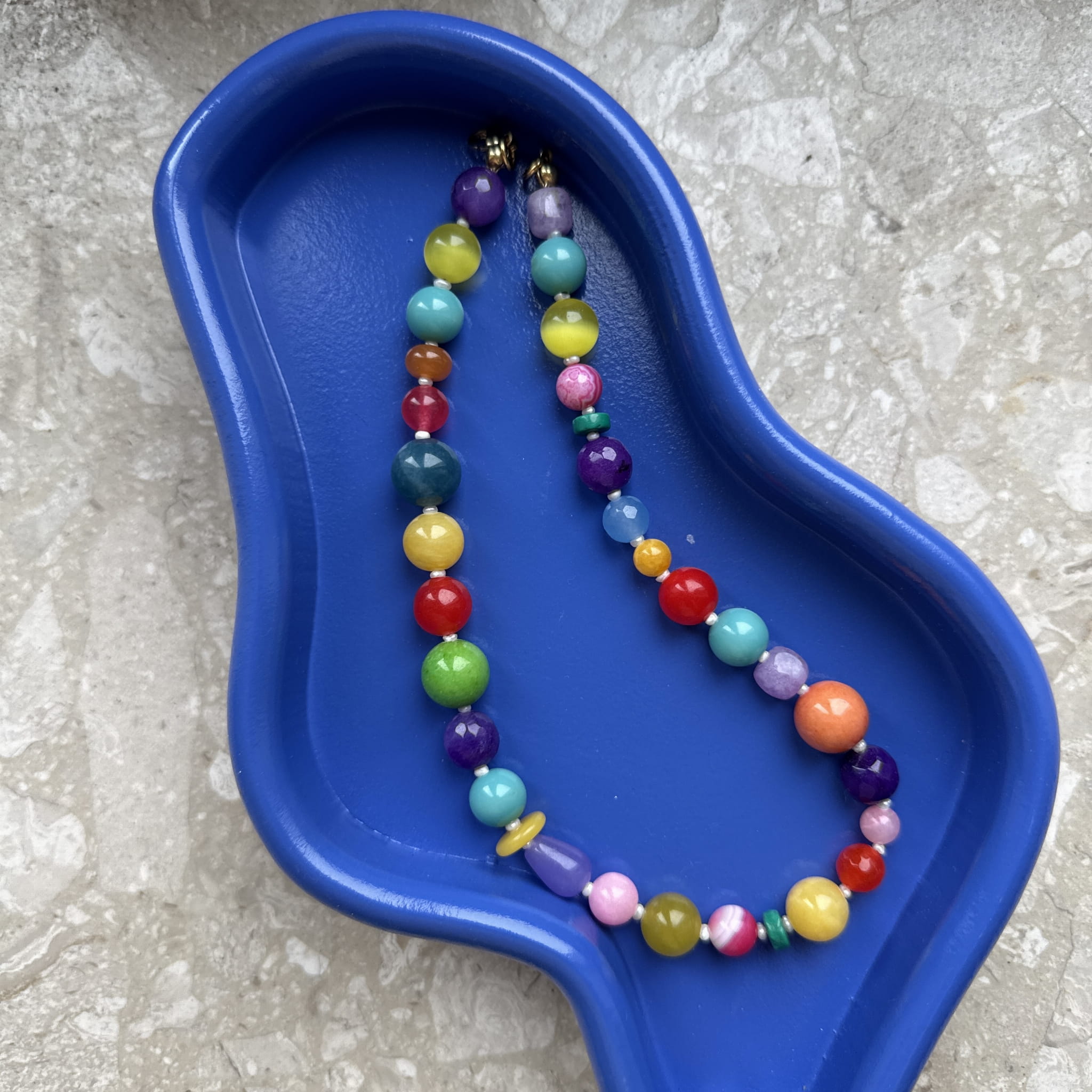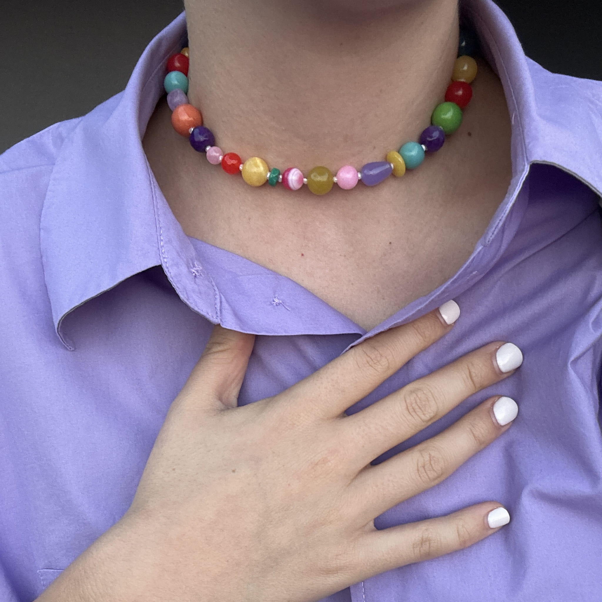 Nasza nowość!! Ten naszyjnik wykonany jest z małych pereł, i kamieni w przepięknej kolorystyce wśrod których znajdziemy m.in Agat, jadeit, ametyst, . Wszystko uzupełnione jest elementami wykonanymi ze pozłacanego srebra próby 925. Świetnie komponuje się z naszymi pozostałymi modelami.