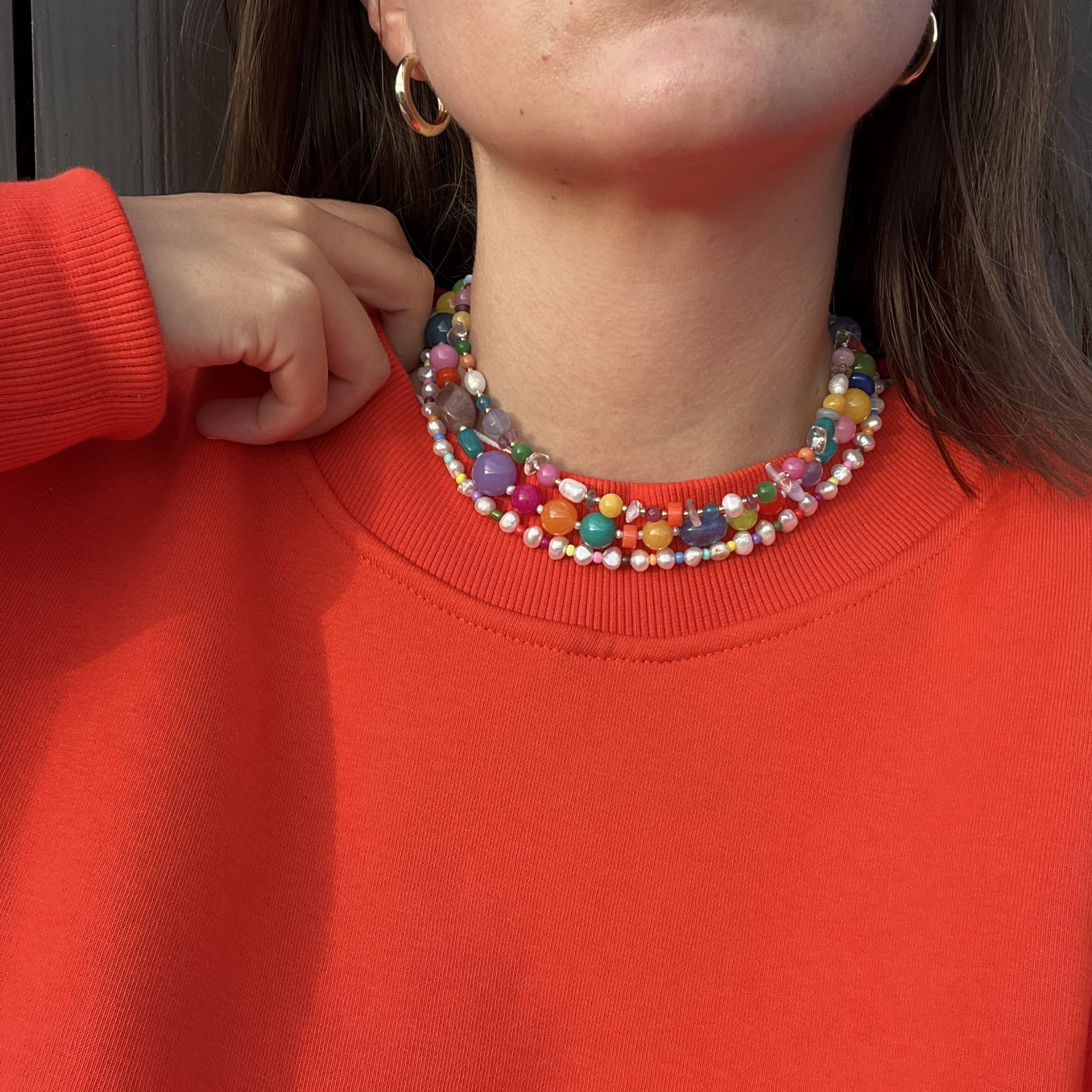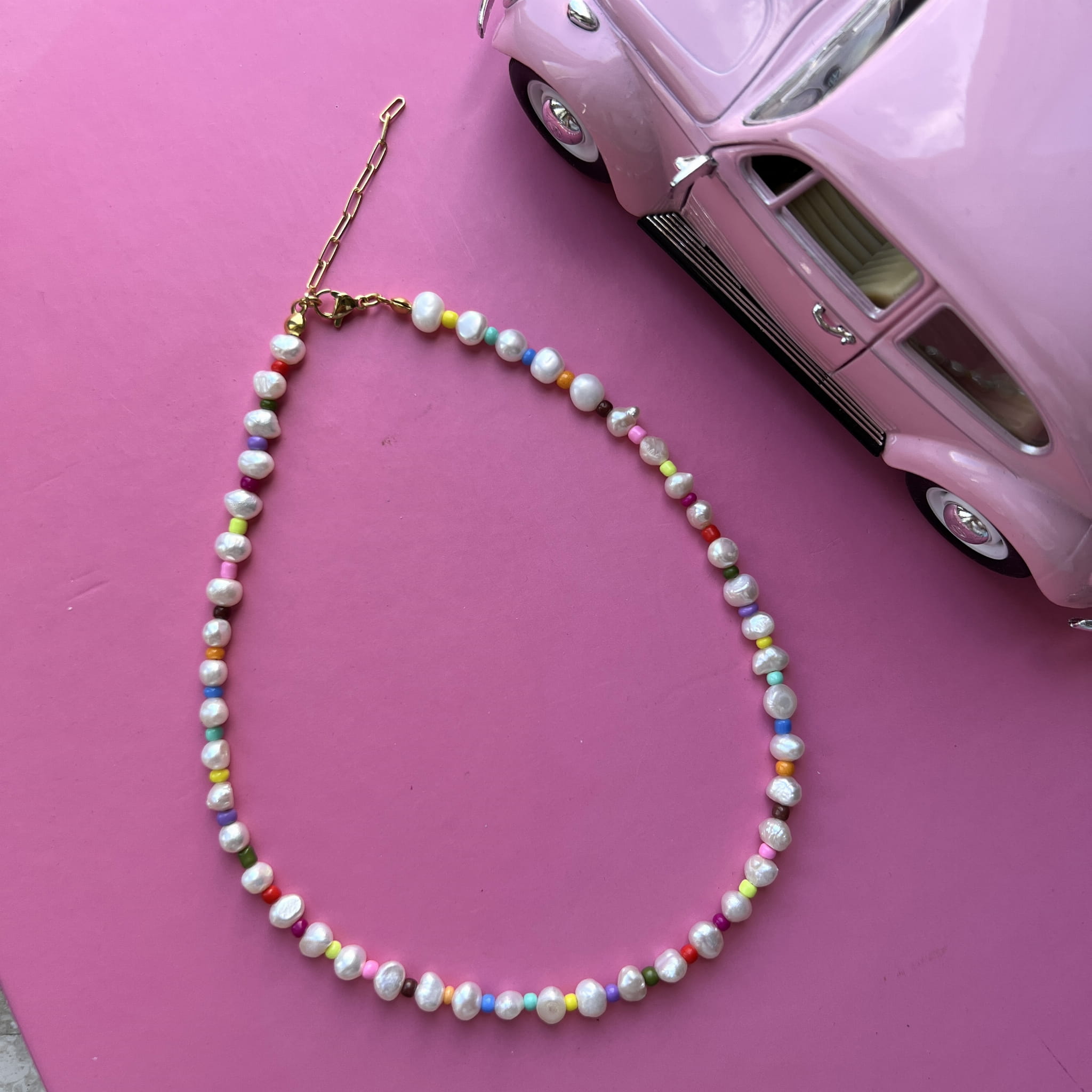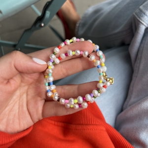 Ten naszyjnik wykonany jest z nieregularnych pereł, które są przeplatane są drobnymi kolorowymi koralikami. Wszystko uzupełnione jest elementami wykonanymi ze pozłacanego srebra próby 925.