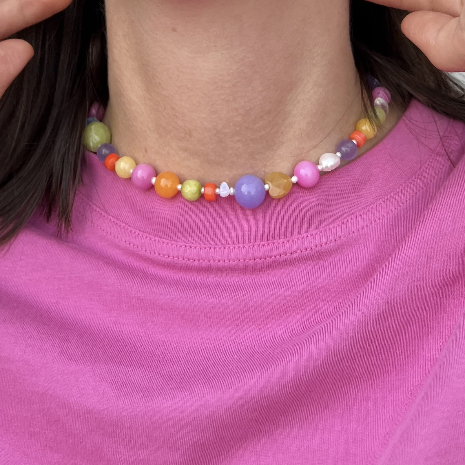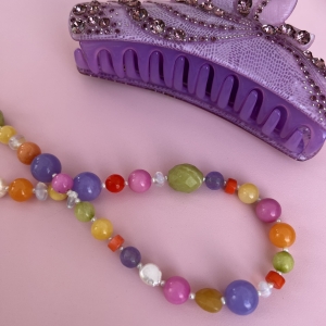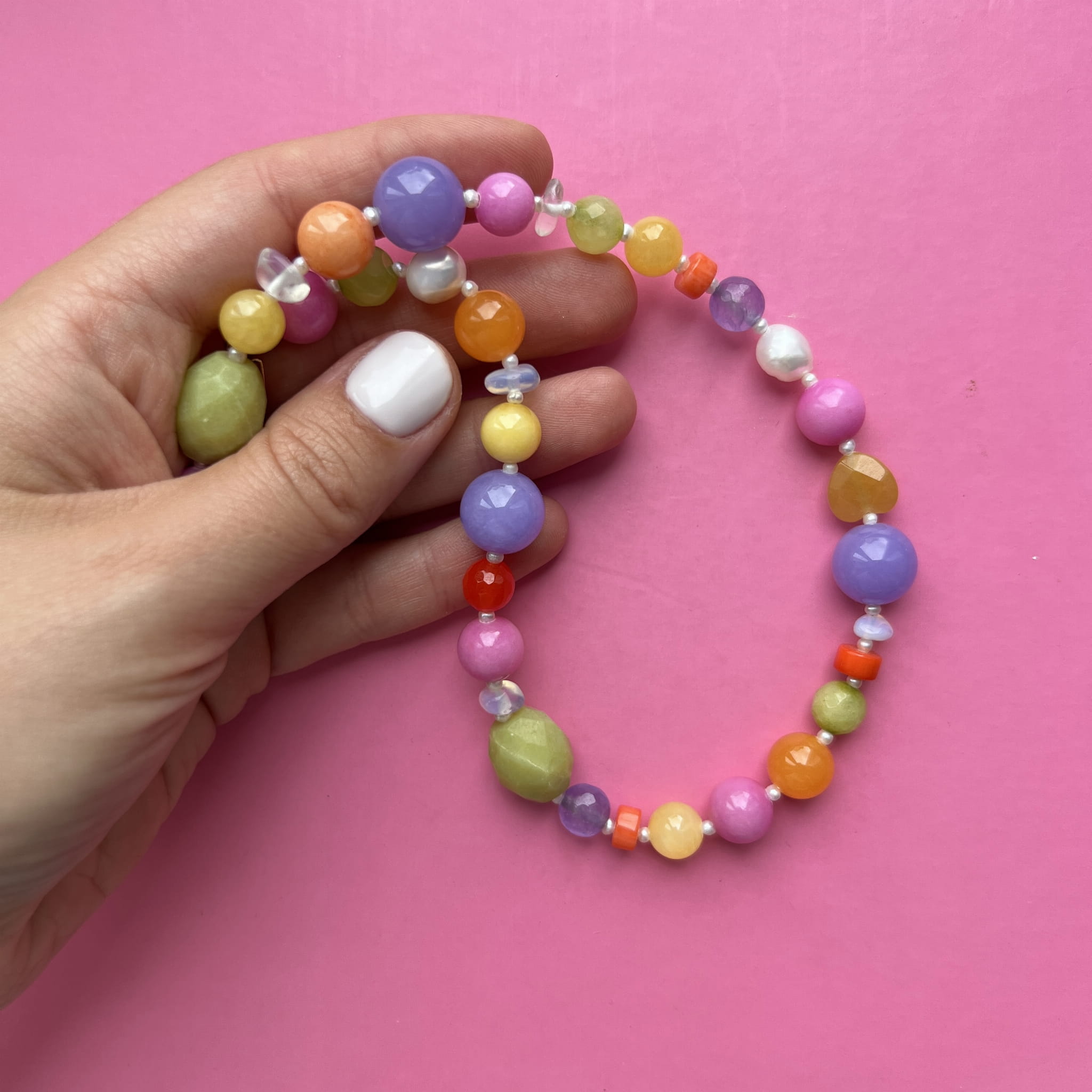Nasza nowość!! Ten naszyjnik wykonany jest z drobnych pereł, i kamieni wśród, których znajdziemy m.in koral, jadeit, agat czy kryształ górski. Wszystko uzupełnione jest elementami wykonanymi ze pozłacanego srebra próby 925. Całość utrzymana jest w pięknej, barwnej kolorystyce i idealnie prezentuje się do każdej stylizacji. Świetnie komponuje się z naszymi pozostałymi modelami.